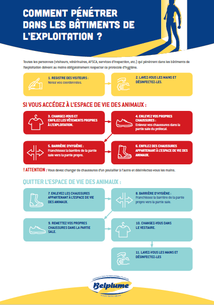 Chaque visiteur, y compris les inspecteurs, auditeurs, vétérinaires, etc. de l'AFSCA, doit au moins respecter le protocole d'hygiène Belplume.