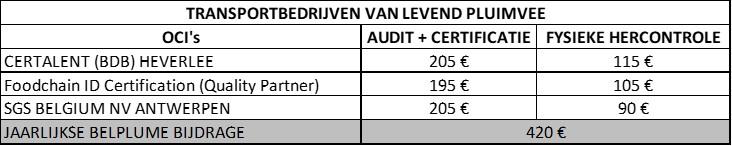 Het tarief (exclusief BTW) voor transport is geldig voor het lastenboek Transport van levend pluimvee.