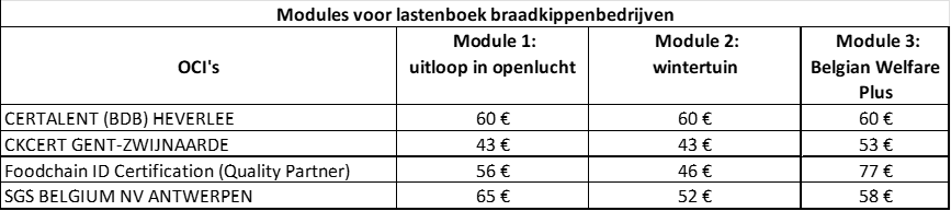De tarieven (exclusief BTW) voor pluimveehouders zijn geldig voor de lastenboeken